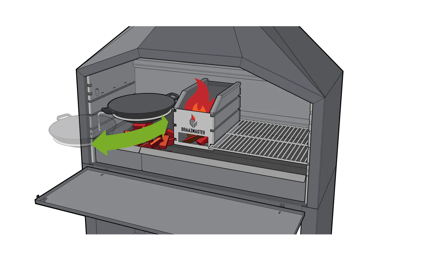 Le support du wok est spécialement conçu pour le Braai Braaimaster afin qu'on puisse facilement pivoter le wok. Un point de charnière se trouve sur la partie avant du barbecue Braaimaster, de sorte que le wok peut être tourné vers l'intérieur et l'extérieur du barbecue Braai.
