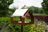 Mangeoire unique et robuste en forme d'une grange ouverte avec un récipient amovible, maintenu en place de manière astucieuse par un bâtonnet en bois de hêtre.